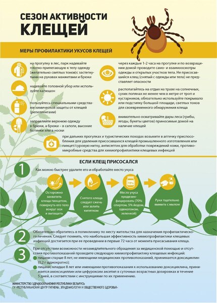 При появлении характерных клинических проявлений клещевых инфекций (появление пятна на месте укуса клеща, повышение температуры, головные боли, боли в мышцах и др.) следует незамедлительно обратиться за медицинской помощью. Инкубационный период составляет при клещевом энцефалите от 2 до 21 суток, при клещевом боррелиозе – от 2 до 30 суток. Обязательно сообщите врачу, что Вами был отмечен факт присасывания клеща.